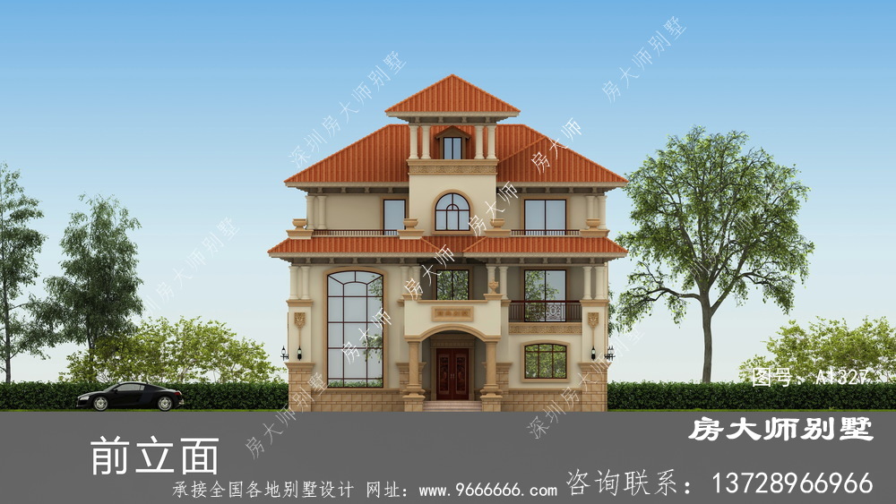 A1327号别墅外墙主要材料:砂岩石板材、真石漆、外墙欧式水泥构件线条及装饰柱、屋面310X310S瓦 |