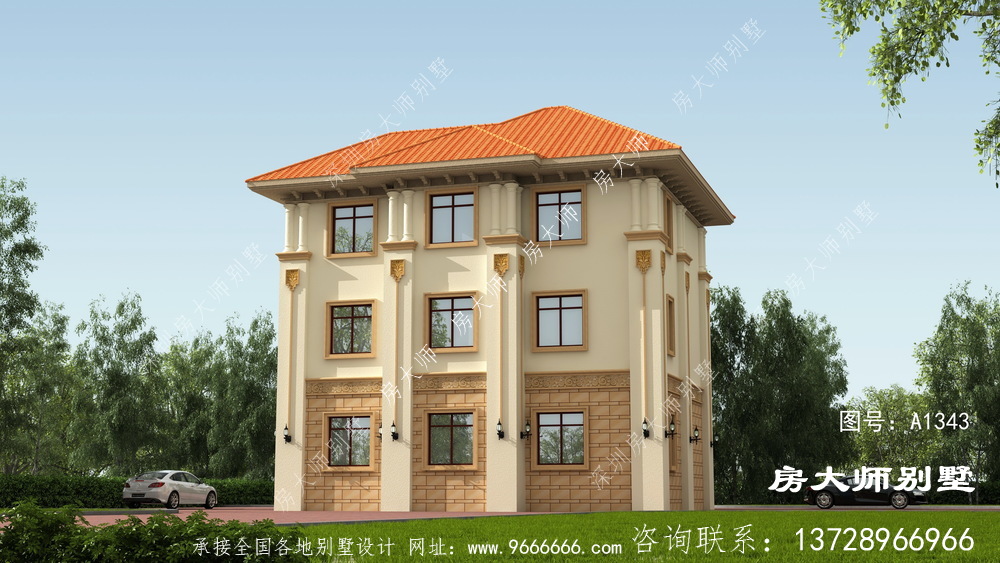A1343号别墅外墙主要材料:砂岩石、真石漆、天然砂岩石浮雕、310X310 S瓦、GRC水泥构件、铁艺栏杆 |