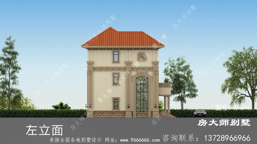 A1344号别墅外墙主要材料:黄锈石、真石漆、、310X310 S瓦、GRC水泥构件、葫芦柱栏杆 |