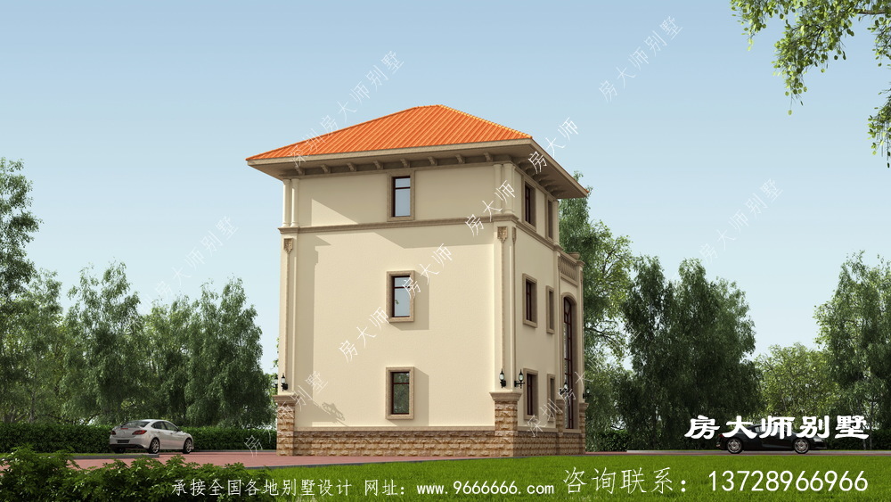 A1387号别墅外墙主要材料:墙脚蘑菇石、外墙真石漆、外墙欧式水泥构件线条及装饰柱、屋面310X310S瓦