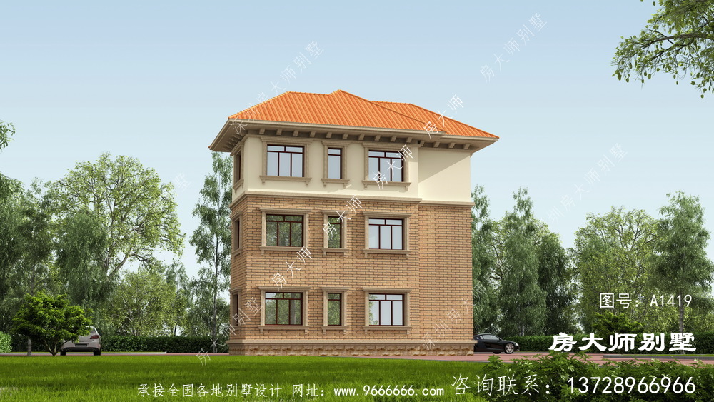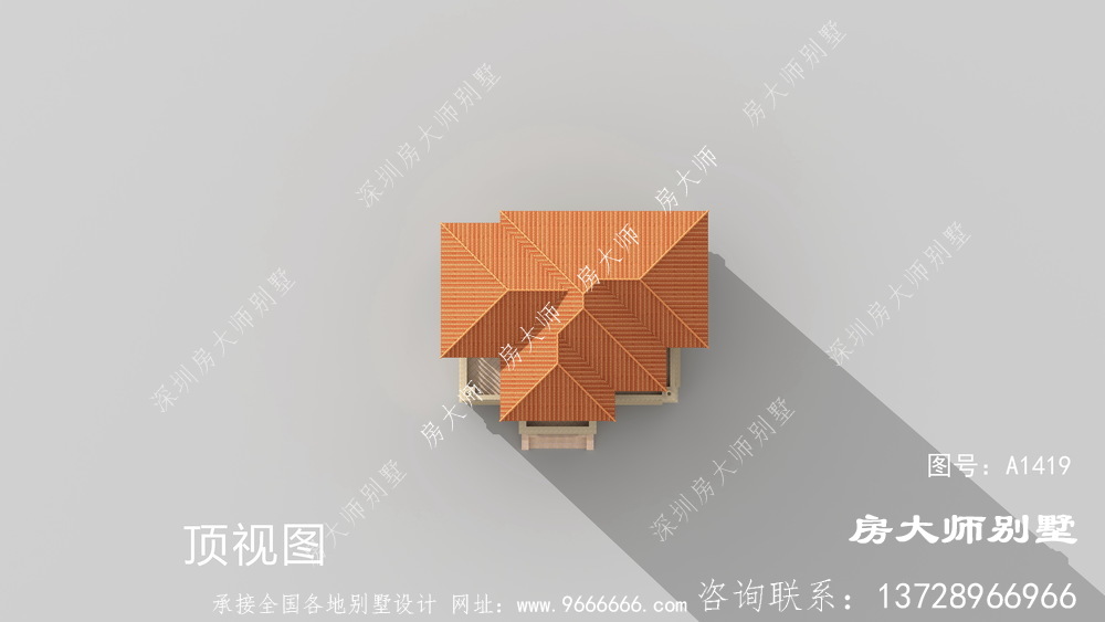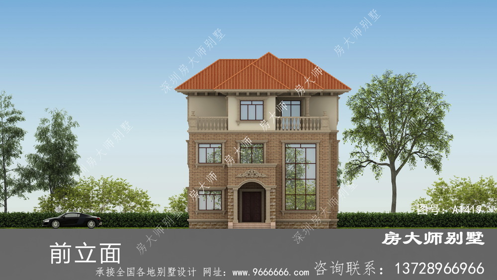 A1419号别墅外墙主要材料:S瓦、劈开砖、黄锈石、真石漆、葫芦柱栏杆 |