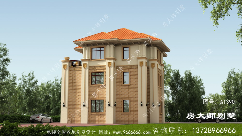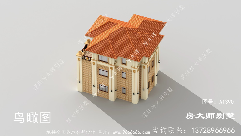 A1390号别墅外墙主要材料:砂岩石、真石漆、天然砂岩石浮雕、310X310 S瓦、GRC水泥构件、铁艺栏杆 |