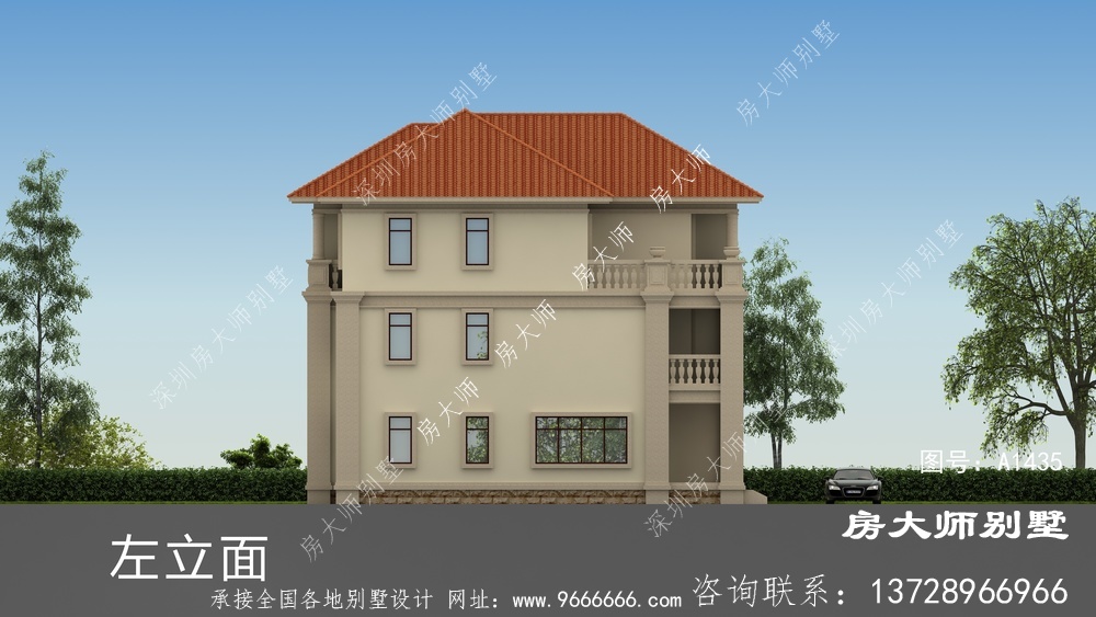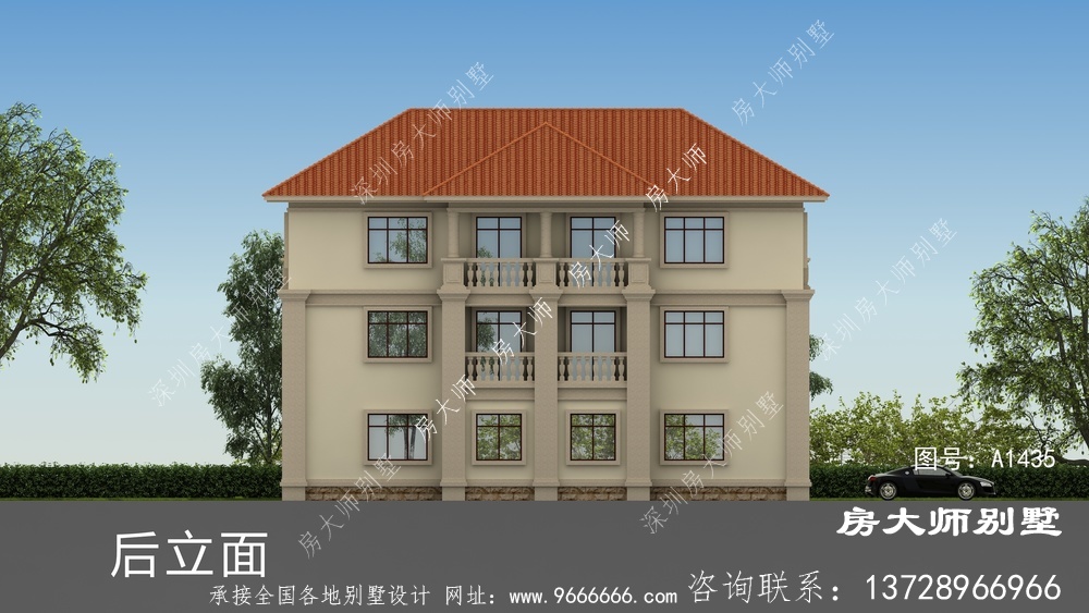 A1435号别墅外墙材料:真石漆、310X310S瓦、蘑菇面黄锈石、GRC水泥构件、葫芦柱栏杆 |