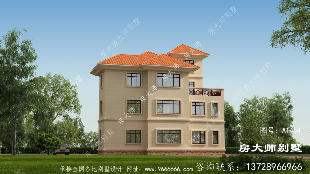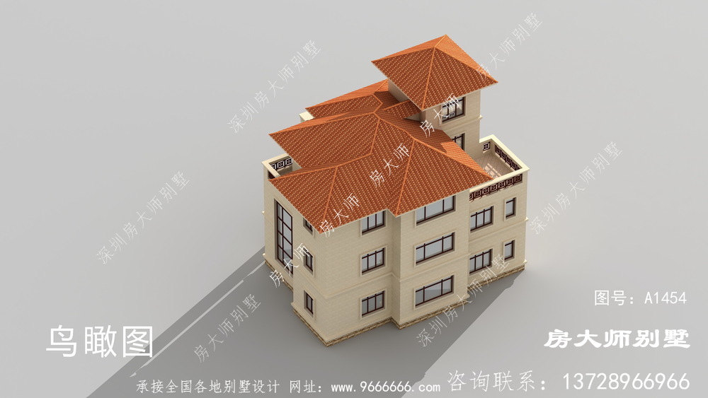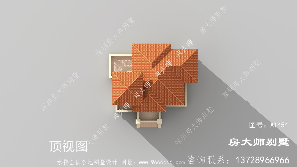 A1454号别墅外墙主要材料:面砖、真石漆、蘑菇面黄锈石、310×310S瓦 |