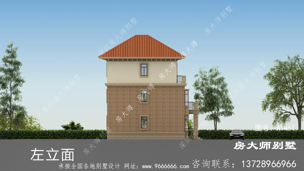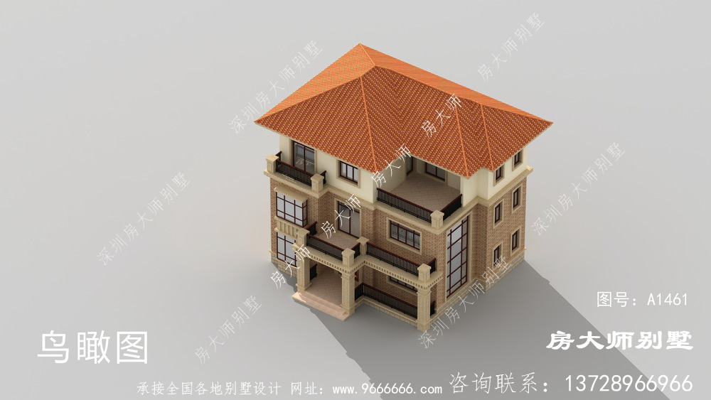 A1461号别墅外墙主要材料:真石漆、劈开砖、黄锈石、310X310S瓦 |