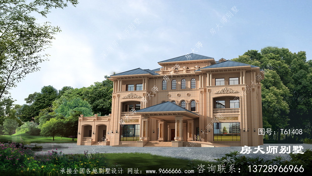 t61408号别墅外墙主要材料:西瓦、沙漠王子石材干挂、砂岩石浮雕